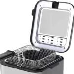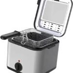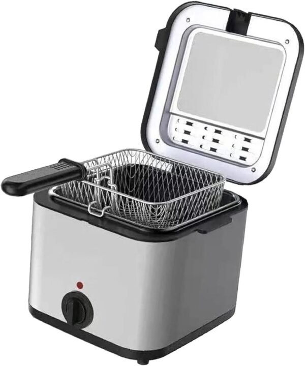 Freidora eléctrica compacta con tapa abatible, ideal para cocinar papas, pollo y empanizados de forma rápida y uniforme.