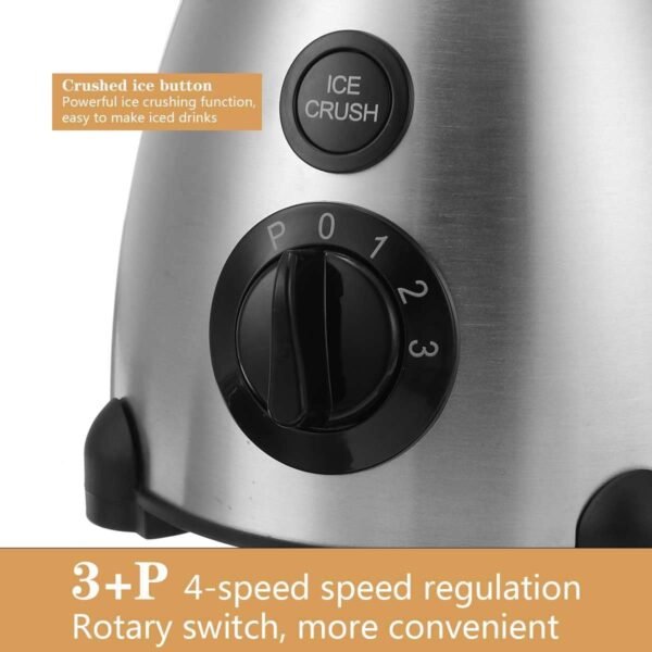 • Base de acero inoxidable con perilla giratoria (0‑1‑2‑3) y modo Ice Crush para triturar hielo sin esfuerzo.