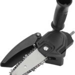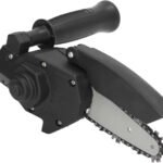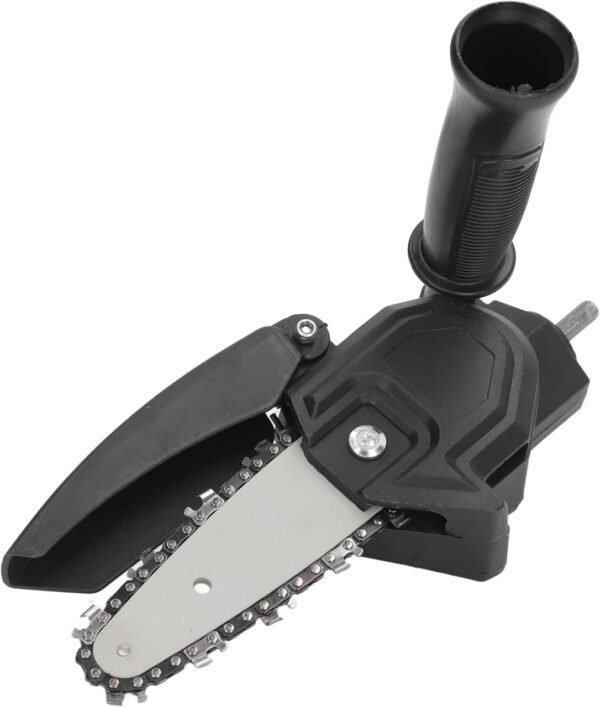 Está compuesta por una pequeña barra guía con cadena de corte, una cubierta de protección plástica negra y un mango auxiliar ergonómico. El cuerpo principal parece hecho de plástico resistente con tornillos visibles que aseguran las piezas. En un extremo se encuentra el eje metálico que permite acoplarla fácilmente al mandril de un taladro eléctrico. El diseño es compacto y portátil, ideal para trabajos ligeros de corte en madera.