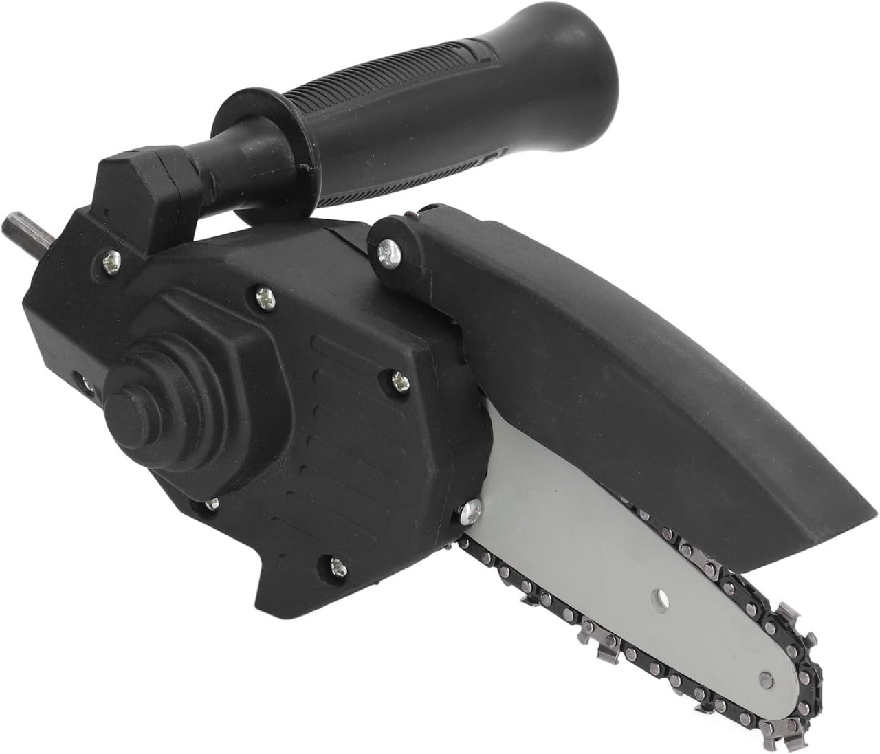Está compuesta por una pequeña barra guía con cadena de corte, una cubierta de protección plástica negra y un mango auxiliar ergonómico. El cuerpo principal parece hecho de plástico resistente con tornillos visibles que aseguran las piezas. En un extremo se encuentra el eje metálico que permite acoplarla fácilmente al mandril de un taladro eléctrico. El diseño es compacto y portátil, ideal para trabajos ligeros de corte en madera.